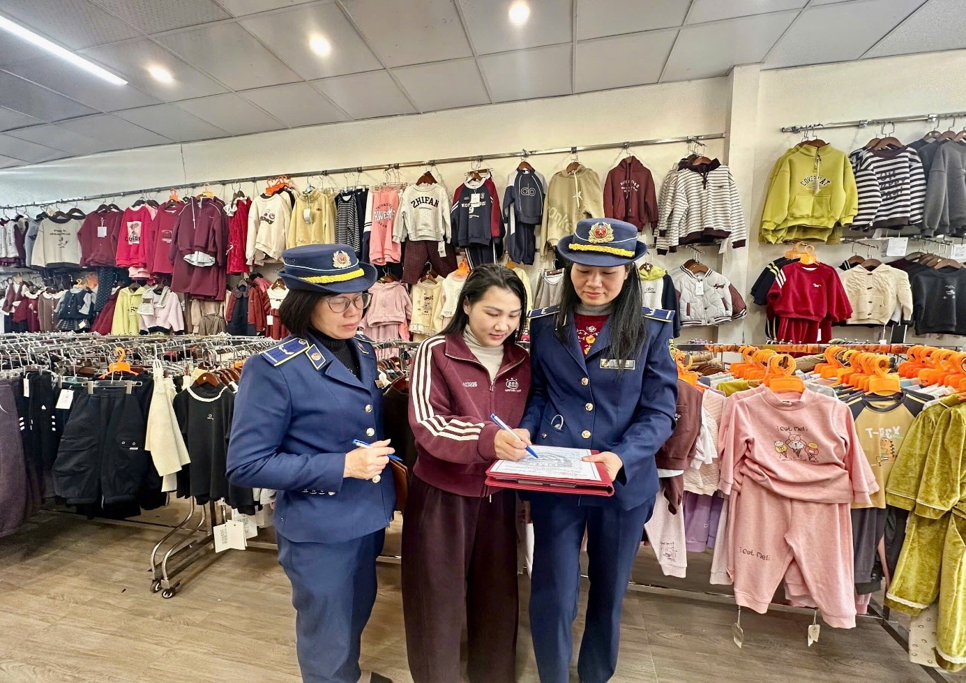 Hình ảnh công chức Đội Quản lý thị trường số 2 thực hiện tuyên truyền, ký cam kết đối với cơ sở kinh doanh